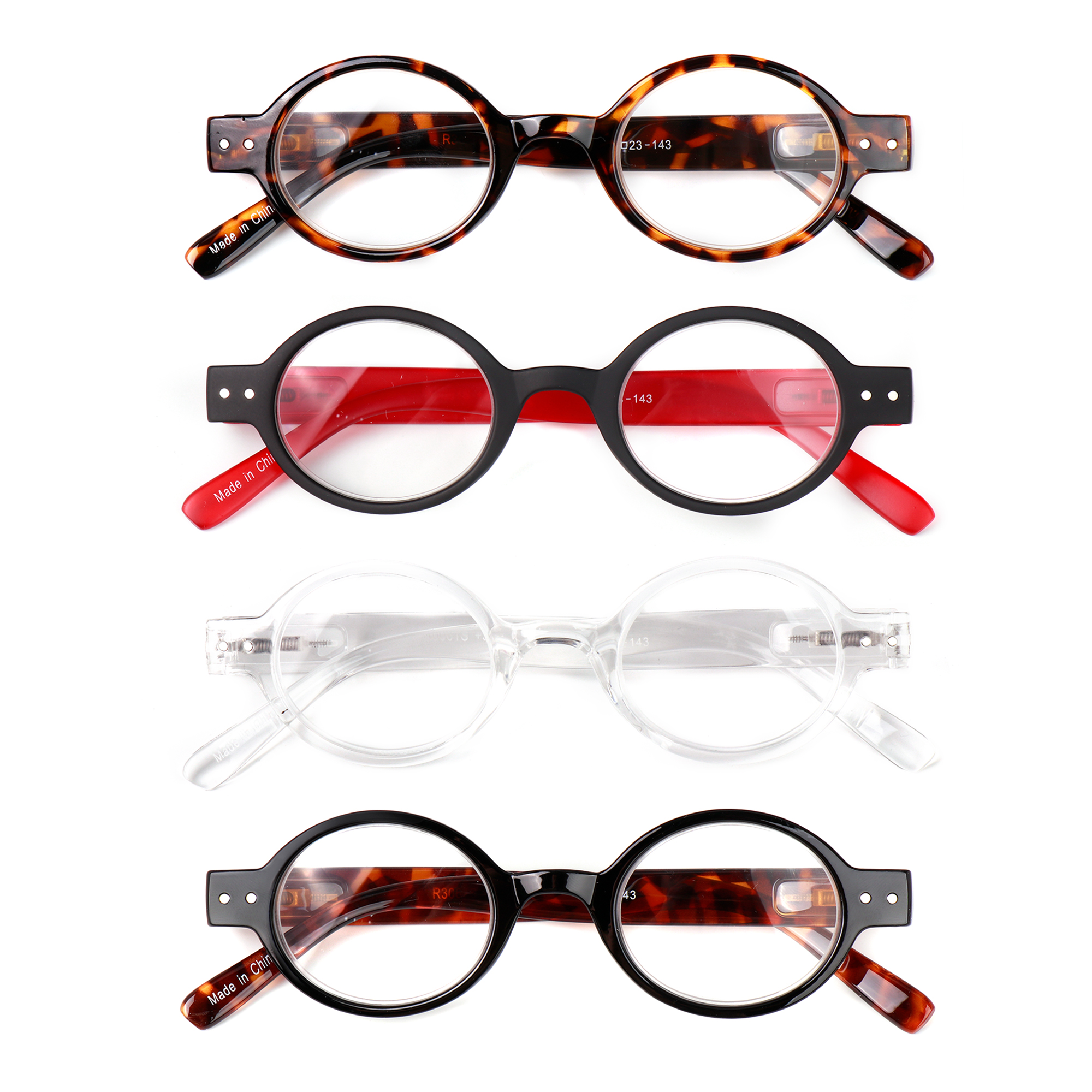 Plastic Frame, Spring Temples with Fully Magnified Lenses. Sold by the dozen. Price subject to change.